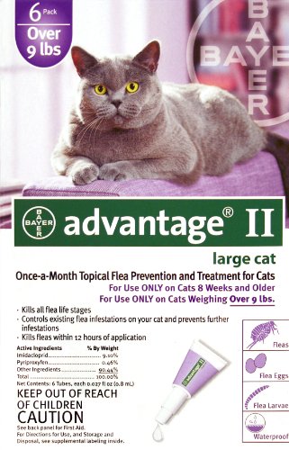 Rid your home of pesky fleas with Advantage II, a fast-working, month-long flea control for your pet. Kills fleas, eggs and larvae. Killing fleas quickly is important, as it prevents them from laying eggs and helps reduce the risk of secondary problems, such as flea allergy dermatitis and tapeworms. Advantage II stops biting fleas in less than 5 minutes, over 99 percent of flea larvae within 20 minutes, at least 98 percent of fleas within 12 hours, and 100 percent of chewing lice in just 1 week. Each application of waterproof Advantage II keeps your cat free of fleas for a full month. Flea bites can cause discomfort for your pet, lead to skin infections and allergic skin reactions causing irritation, and can even transmit other disease-causing organisms. Safe for all cats 8 weeks or older that weigh 9+ pounds. Includes a 6-month supply.